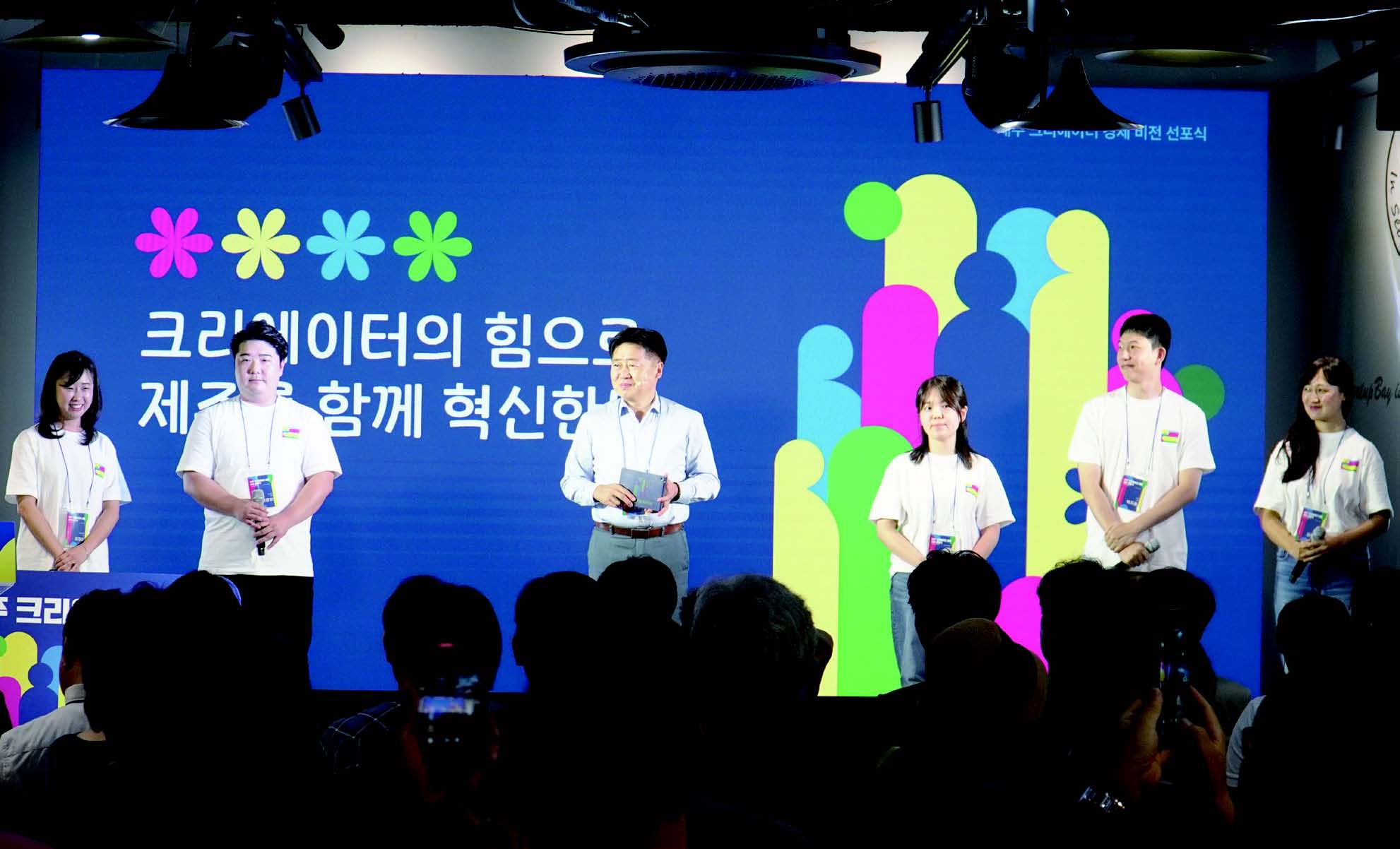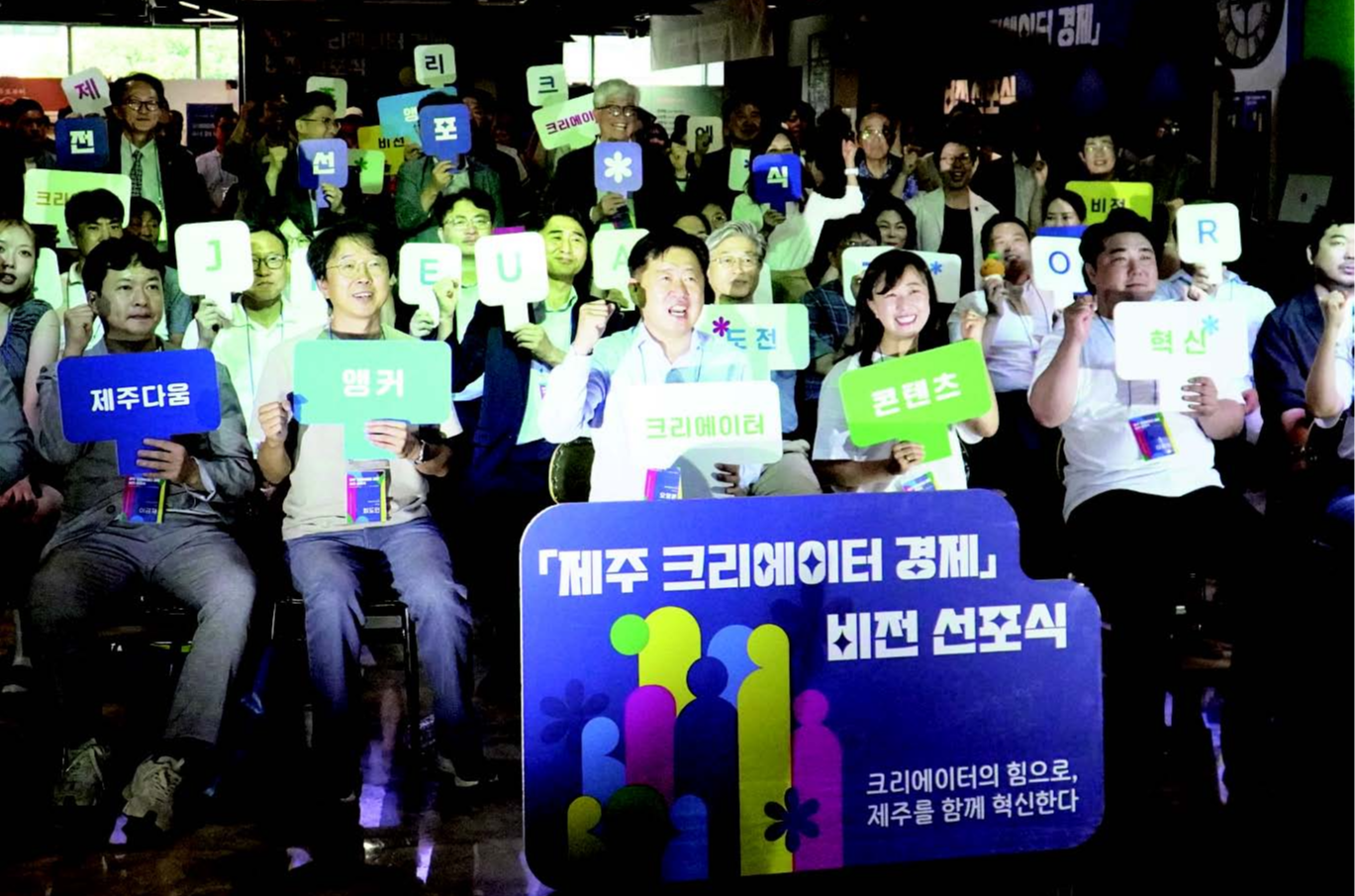 제주 크리에이터 경제모델 비전을 선포하는 오영훈 도지사와 크리에이터 |